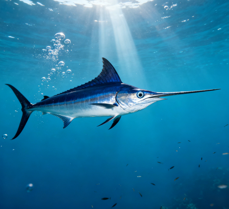 成体 2-3.5 米,吻部尖锐如剑,捕食鱼类 / 头足类。