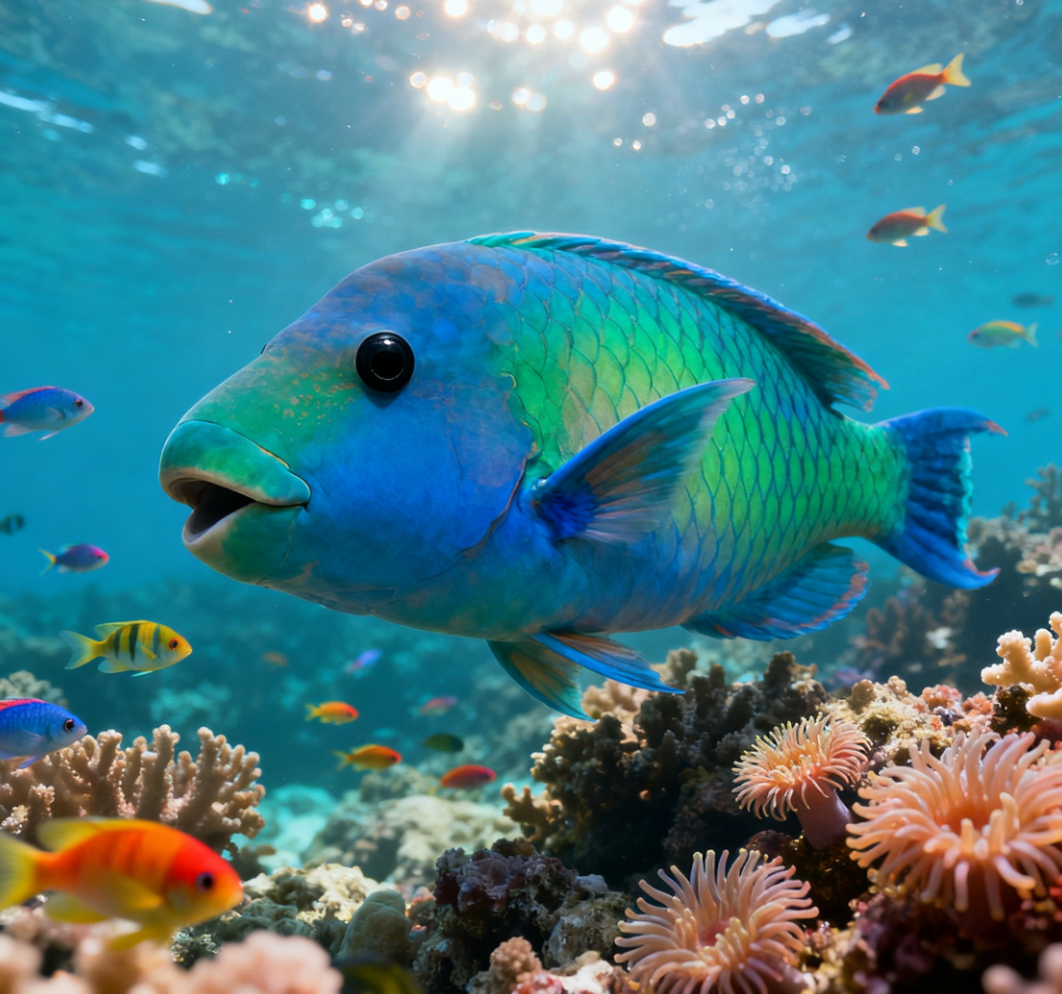 成体 0.8-1.2 米,体色鲜艳,植食性(啃食珊瑚藻类),珊瑚礁生态关键物种。